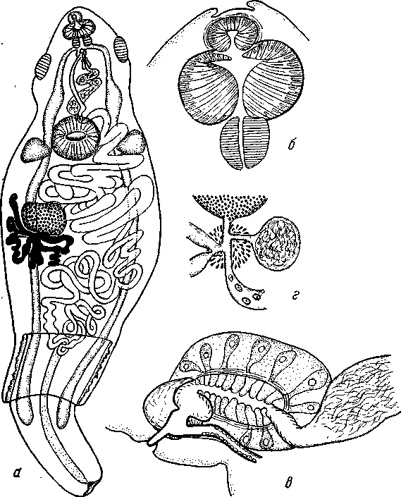 a — марита; б — срез переднего конца тепа с преоральной и ротовой присосками и фаринксом; в — срез через выводные половые протоки; г — схема женского полового аппарата
