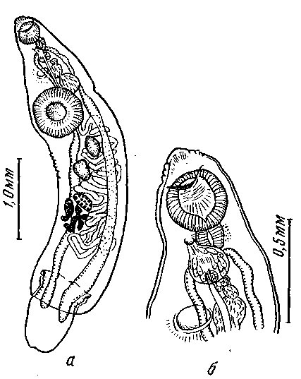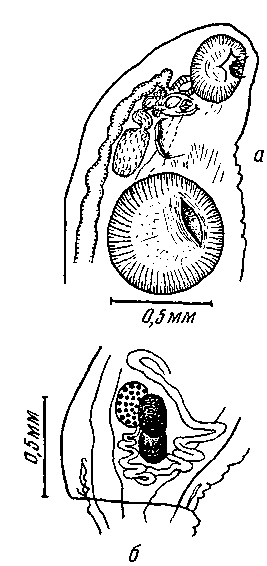 а — передний конец тела с выводными половыми протоками; б — женские половые органы