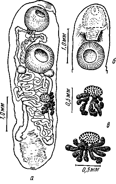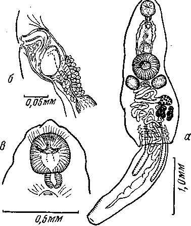 a — марита; б — передний конец тела; в — яичник с желточниками