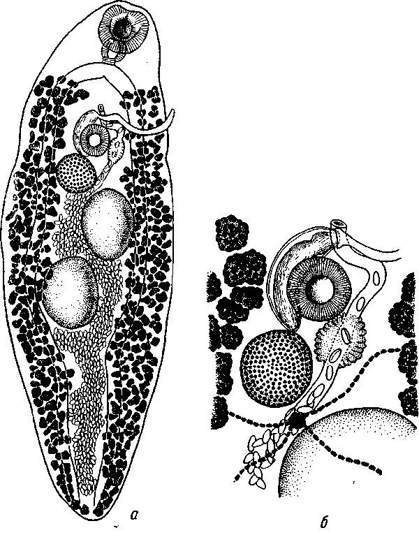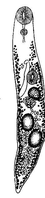 Яичник слегка овальный, 0,140 X 0,120 мм, лежит слева от брюшной присоски, своим правым концом слегка заходит на брюшную присоску. Расстояние между яичником и передним семенником 0,250 мм.