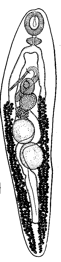Желточники начинаются непосредственно за фаринксом и идут двумя боковыми полями до конца тела. На переднем конце, позади фаринкса, отдельные фолликулы проникают до срединной линии тела.