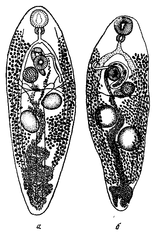 Семенники почти круглые, лежат позади яичника, наискось один позади другого. Передний семенник достигает 0,19—0,22 мм в диаметре, расположен слева в середине средней трети длины тела. Задний семенник лежит справа, немного позади средней трети длины тела или на расстоянии одной трети тела от заднего конца.