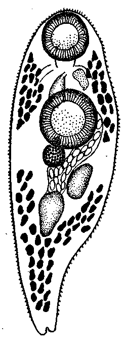 Яичник несколько меньше семенников, более или менее круглый, лежит позади брюшной присоски и впереди семенников, причем его передний край находится на уровне заднего конца половой бурсы. Яичник 0,17 X 0,18 мм. Семяприемника нет. Тельце Мелиса слабо развито, поперечно удлиненное, расположено между яичником и передним семенником. Желточные протоки хорошо развиты. Желточники состоят из очень многочисленных фолликулов разной величины, начинаются позади уровня бифуркации кишечника и простираются приблизительно до окончаний кишечных стволов; они расположены за пределами, а также в области кишечных стволов и соединяются сзади, на некотором расстоянии позади заднего семенника. В передней части желточники остаются раздельными.