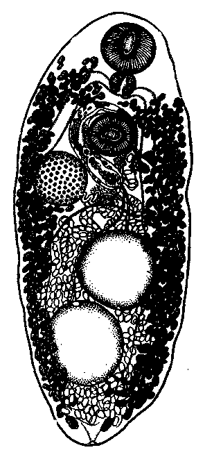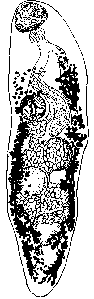 Plagiorchis (Plagiorchis) mustelae Petrow et Kadenazii, 1954 (по Петрову и Каденации, 1954)