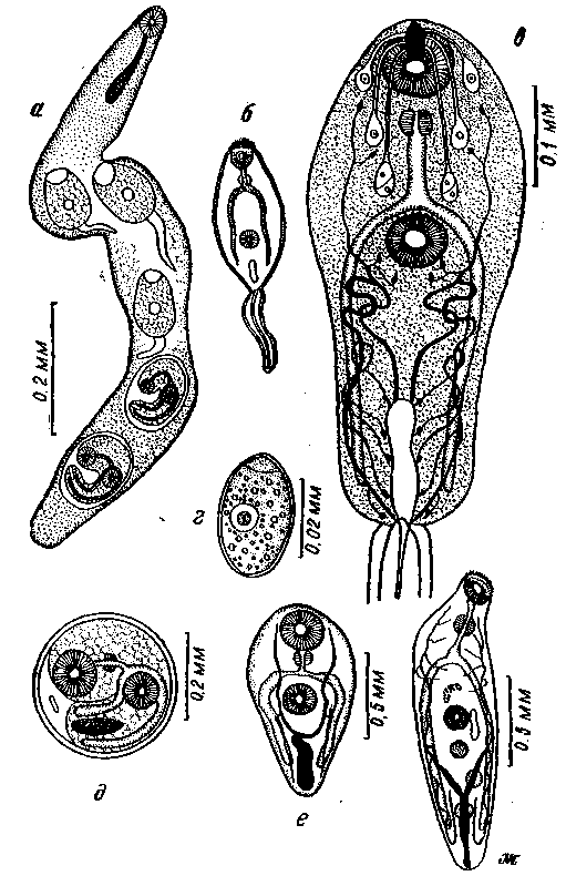 Цикл развития: a — редия с церкариями; б — церкарий; в — тело церкария; г — яйцо; д — метацеркарий в цисте; е— метацеркарии без цисты; ж — марита 5-дневного возраста