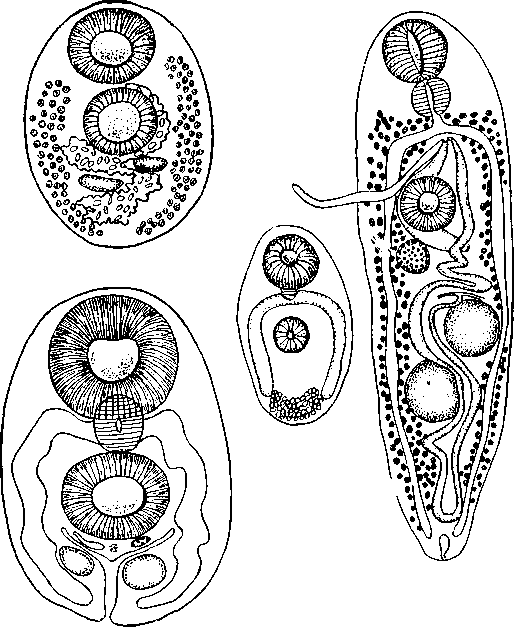 Plagiorchis (Multiglandularis) jaenschi Johnston et Angel, 1951 (по Джонстону и Энглу, 1951). Разные стадии развития мариты
