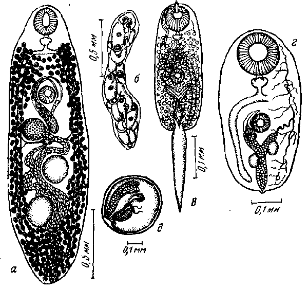 a — марита; б — редия о церкариями; в — церкарий; г — метацеркарий без цисты; д — циста с метацеркарием