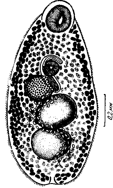 Интенсивность и экстенсивность инвазии: у одной белозубки из пяти вскрытых было найдено 64 трематоды.