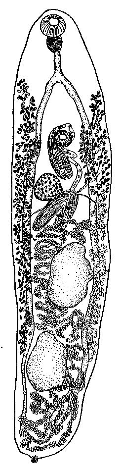 Префаринкс очень короткий, не более 0,028 мм. Фаринкс часто имеет волнистый передний край и достигает у зрелых экземпляров 0,052—0,079 X 0,067—0,102 мм; у молодых форм он меньшего размера. В области фаринкса по обеим сторонам имеются скопления многочисленных железистых клеток, открывающихся в пищевод непосредственно позади фаринкса. Короткий пищевод раздваивается и переходит в кишечные стволы, почти достигающие заднего конца тела.