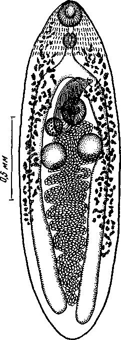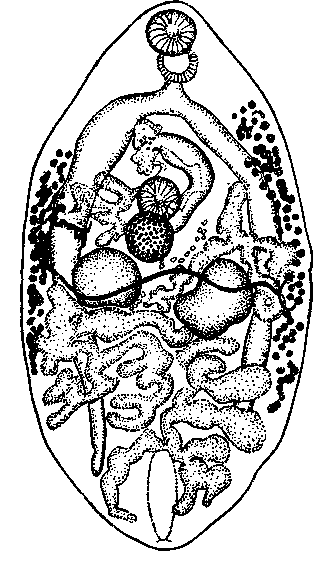 Круглые семенники расположены на середине тела; размер их 0,35— 0,45 X 0,37—0,42 мм. Крупная половая бурса, имеющая вогнутость на внутреннем крае, лежит между зонами брюшной присоски и яичника и достигает 0,70—0,82 мм длины и 0,17—0,20 мм ширины; она содержит способный выдвигаться циррус, а в задней своей части — семенной пузырек. Половое отверстие расположено позади бифуркации кишечника, несколько сбоку.