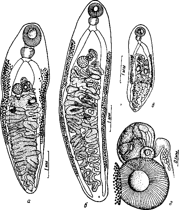 Яичник круглый, расположен впереди семенников и обычно сейчас же впереди брюшной присоски (иногда проникает в ее область) и в поле заднего семенника; он достигает 0,23—0,53 X 0,27—0,55 мм. Семяприемник лежит сбоку и немного позади яичника; он достигает 0,08—0,18 X 0,07—0,20 мм. Слабо выраженное тельце Мелиса лежит в области семяприемника. Желточники состоят из хорошо развитых, более или менее сливающихся фолликулов, которые начинаются позади бифуркации кишечника или в области брюшной присоски и оканчиваются в задней трети тела на расстоянии 0,47—2,24 дни от заднего его конца; обычно желточники занимают область кишечных стволов и латерально от них, редко проникая в область между кишечными стволами.