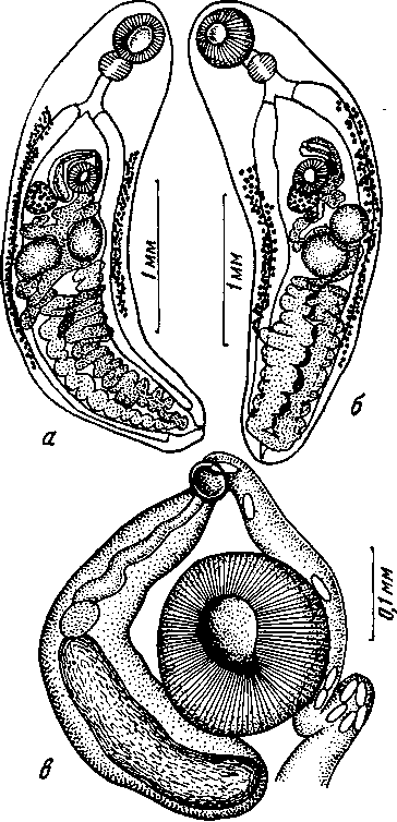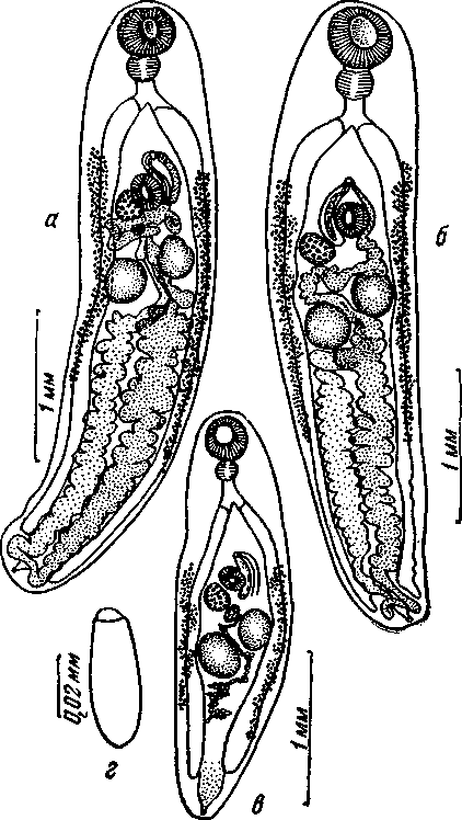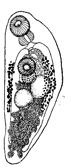 Яичник находится в поле заднего семенника, причем его зона обычно совпадает с зоной брюшной присоски; размер яичника 0,18— 0,25 X 0,18—0,27 мм. Маленький семяприемник расположен в области яичника, позади него; он достигает 0,11—0,13 X 0,10—0,13 мм. Тельце Мелиса находится в зоне семяприемника. Желточники состоят из относительно мелких фолликулов, которые начинаются в области половой бурсы и оканчиваются на расстоянии 0,60—1,27 мм от заднего конца тела, занимая область кишечных стволов и участки латерально от них. Нисходящая и восходящая ветви матки образуют поперечные петли, в которых лежат желтоватые яйца с крышечками, достигающие 0,042 X 0,013 мм. Экскреторное отверстие субтерминальное, вентральное.