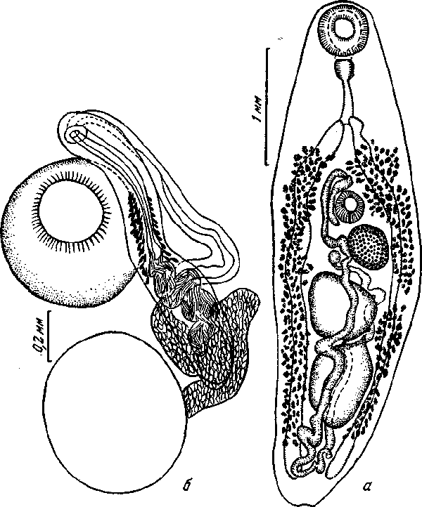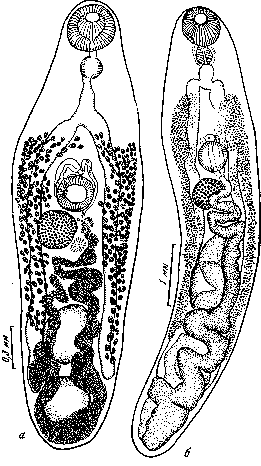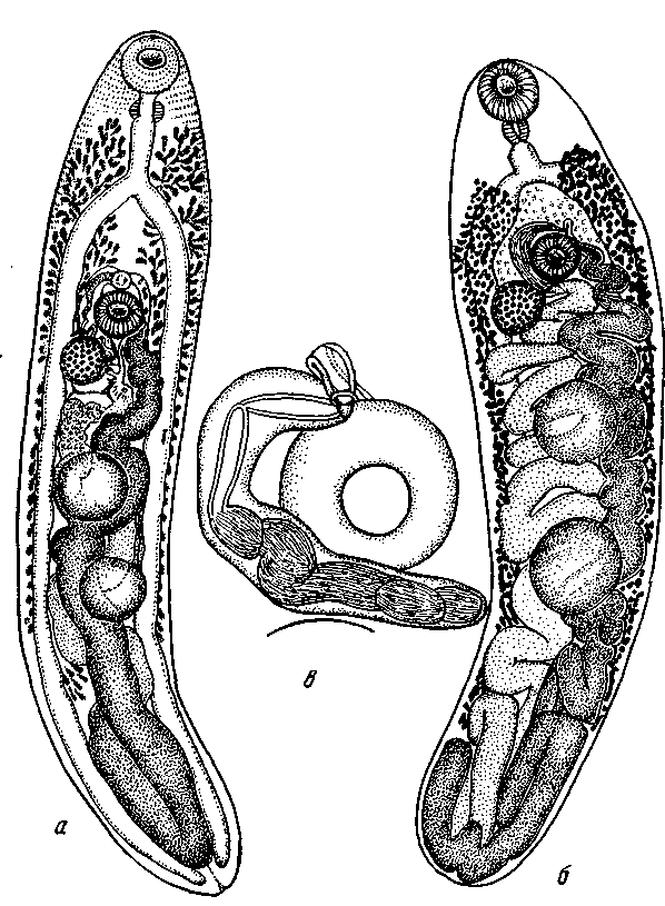 Самые молодые экземпляры, длина которых не превышала 0,65 мм, уже обладали внутренним строением, типичным для взрослых. Кишечник был ясно виден как красноватая трубка; отчетливо были заметны семенники и яичник. У экземпляров 2,5 мм длины в женских протоках имелись уже сперматозоиды, но не было яиц, которые были впервые найдены в паразитах, достигавших около 4 мм длины.