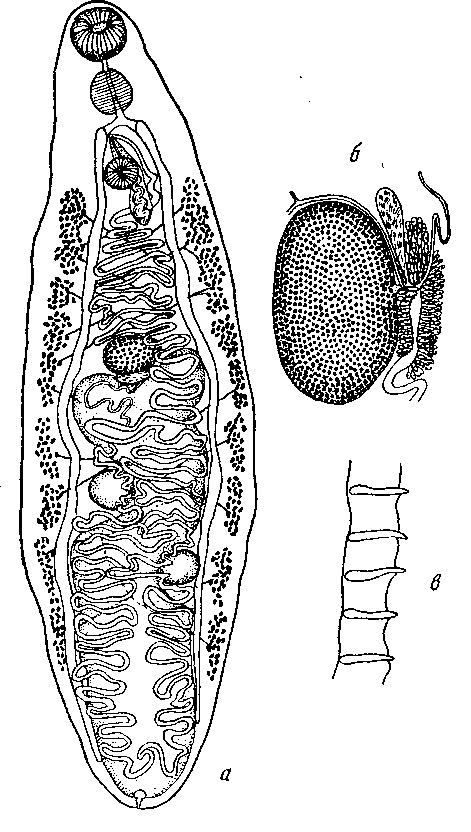 a — марита; б — схема женской половой системы; в — шипики на кутикуле