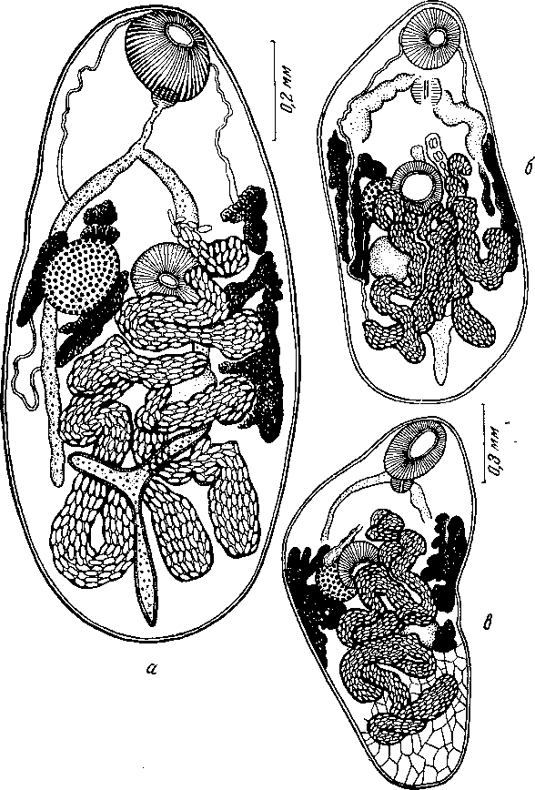 а - прогенетический метацеркарий из головастика Alytes obstetricans; б, в — экземпляры, добытые в кишечнике ужей на 6-й день после заражения