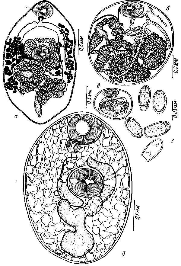 а — метацеркарий 15-дневного возраста; б — то же 30-дневного возраста; в — карликовая форма метацеркария; г — яйца; д — 3-дневный метацеркарий от экспериментально зараженного головастика Alytes obstetricans.