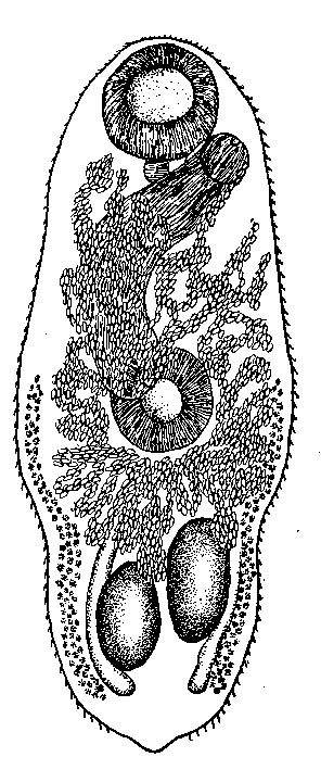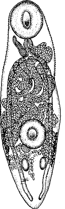 Субтерминальная, ясно заметная ротовая присоска достигает 0,315— 0,465 мм в диаметре. Брюшная присоска лежит почти на середине тела или немного позади середины; она меньше ротовой, 0,25—0,45 мм в диаметре.