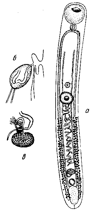 a — марита; б — выводные протоки половых желез; в — схема женской половой системы