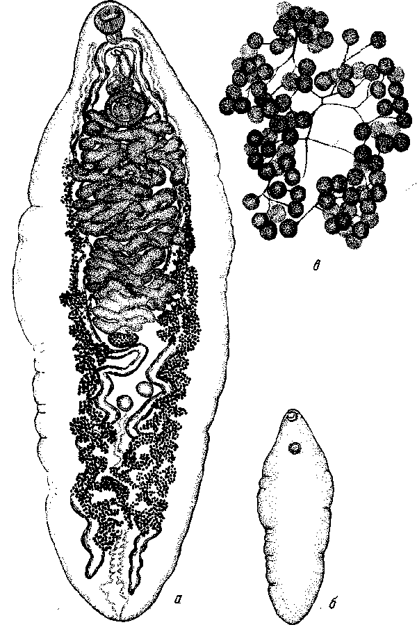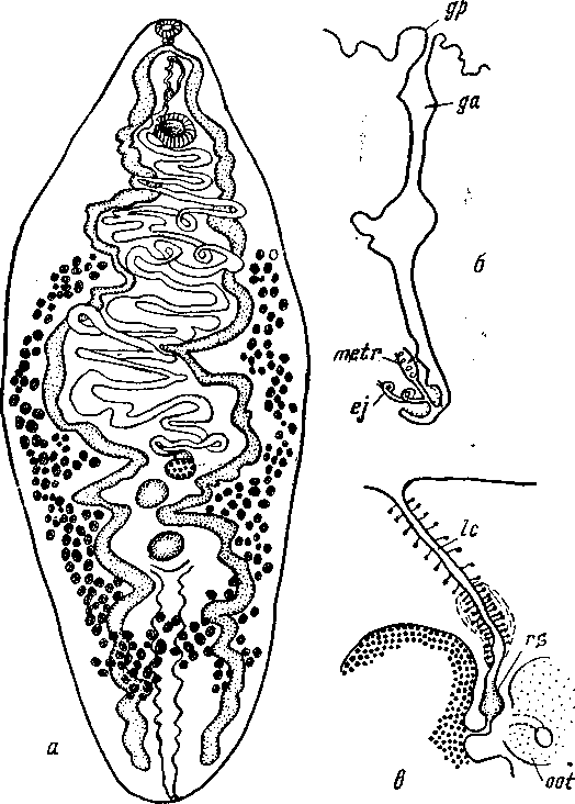 a — марита; б — концевой участок полового аппарата; в — схема женской половой системы; gp — половое отверстие; ga — половой атриум; metr — метратерм; ej — семяиавергательный канал; ic — лауреров канал; oot — оотип; гs — семяприемник