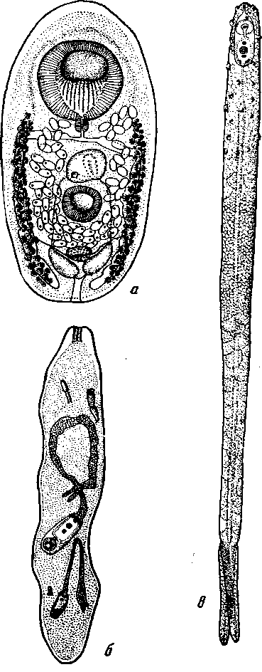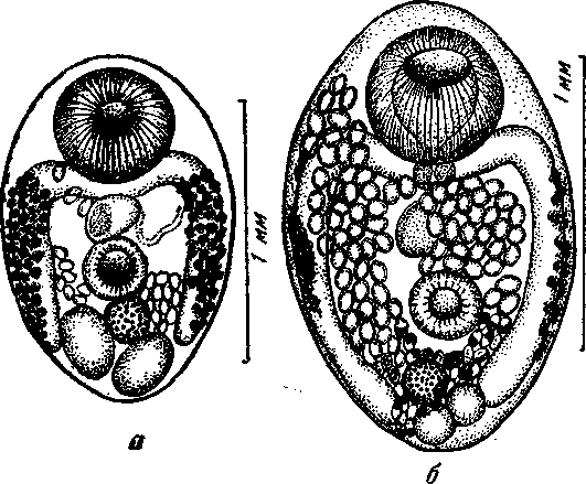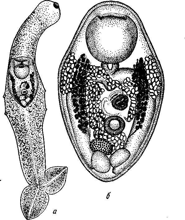a — Cercaria catenaria от Goniobasis catenaria; б — марита от Apomotis cyanellus