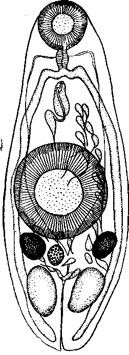 Парные желточники 0,192 мм в диаметре; они находятся впереди от семенников. Круглый яичник лежит впереди желточников; его диаметр 0,144 мм. Вправо от яичника имеется маленький шаровидный семяприемник и короткий отходящий от него лауреров канал. Яйцевод идет от яичника к семяприемнику и затем круто поворачивает назад, принимая общий желточный проток, и продолжается в виде матки. Матка сильно извитая, слегка закрывающая яичник. Позади яичника нет петель матки. Средняя часть тела почти полностью заполнена набитой яйцами маткой.