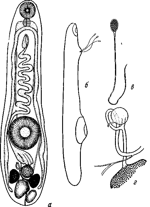 a — марита вентрально; 6 — внешний вид латерально; в — яйцо; г — схема женской половой системы