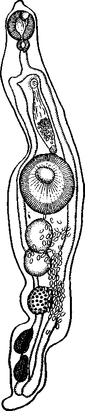 Впереди переднего семенника в общий собирательный экскреторный проток входят два боковых ствола. Боковые экскреторные стволы идут вперед, достигая уровня фаринкса.