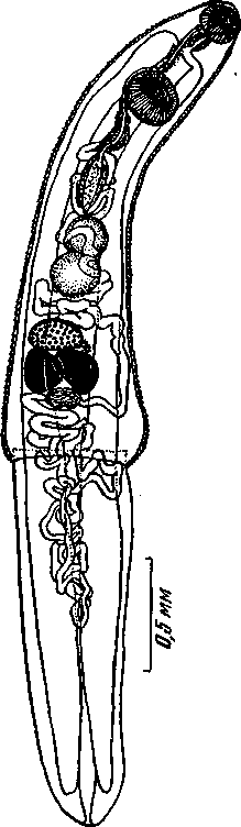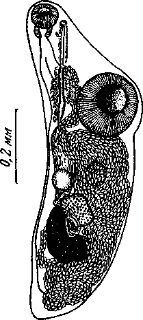 Яичник поперечно вытянут, 0,060 X 0,090 мм, расположен с вентральной стороны справа от медианной линии на заднем конце средней трети тела. Желточник компактный, с резко выраженным вырезом на переднем крае, расположен вентрально непосредственно позади яичника; его диаметр 0,105 X 0,175 мм. Имеется маточный семяприемник. Матка проходит до заднего конца дорзально и дорзо-латерально по отношению к яичнику, затем вентрально от левого семенника и, наконец, проходит прямо вперед, слева от простатической части. Яйца эллиптические, достигают 0,021 — 0,024 X 0,010—0,012 мм. Экскреторное отверстие терминальное; экскреторные ветви соединяются дорзально от фаринкса.