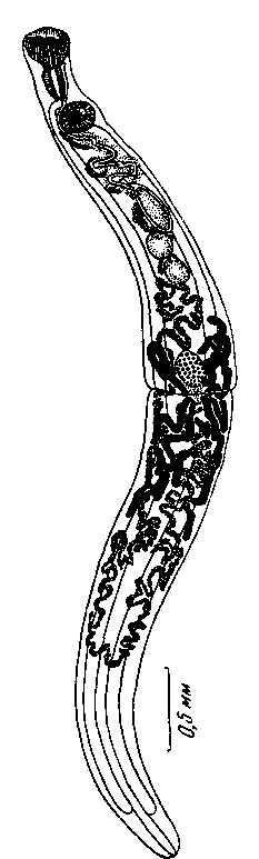 Описание вида (по Ямагути, 1953). Тело довольно тонкое, несколько суженное в области шейки и позади брюшной присоски; длина его достигает 1,9—3,2 мм, включая хвостовой придаток, длина которого равна 0,8—1,5 мм; ширина тела в области яичника и желточника 0,30—0,48 мм. Хвостовой придаток сзади суживается к более или менее острому кончику. Ротовая присоска чашевидная, с двумя ясно выраженными субмедианными выемками на вентральном крае; ее размеры 0,13— 0,23 X 0,18—0,24 мм. Фаринкс субцилиндрический, 0,075—0,130 мм длины при ширине 0,060—0,100 мм. Пищевод длиной до 0,075 мм направлен дорзально, раздваивается на два широких кишечных ствола, оканчивающихся близ заднего конца тела. Брюшная присоска, 0,135—0,165 мм в диаметре, находится в области середины передней трети тела.