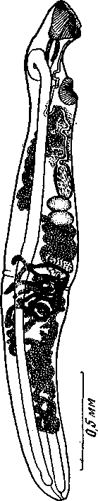 Матка простирается назад дальше середины хвостового придатка, до уровня, отстоящего на 0,27—0,63 мм от его заднего конца; она проникает в пространство между яичником и задним семенником и проходит дорзально от семенников, семенного пузырька и простатической части. Яйца овальные, содержат личинку, достигают 0,016—0,021 X 0,009—0,012 мм. Экскреторное отверстие находится терминально. Ветви экскреторного пузыря соединяются дорзально от фаринкса или ротовой присоски.