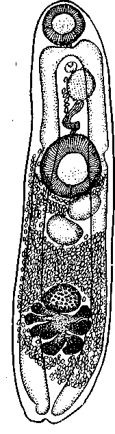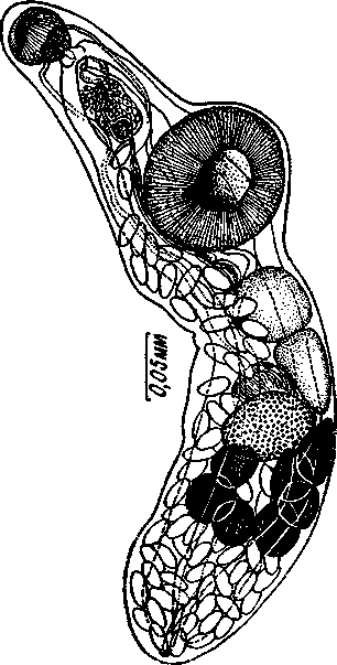 Матка заполняет все свободное пространство задней части тела, кроме узкого пространства между брюшной присоской и передним семенником. Матка входит в гермафродитную бурсу вентрально и влево от семенного пузырька и простатической части. Яйца эллиптические, достигают 0,030—0,033 X 0,014— 0,015 мм. Экскреторные ветви соединяются дорзально от фаринкса.