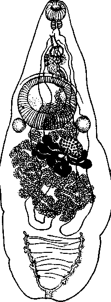 Семенники овальные, 0,18—0,20 X 0,22—0,25 мм, расположены по диагонали один позади другого в средней трети тела, разделены петлями матки. Семенной пузырек разделен на три части; самая крупная задняя часть, достигающая 0,125 мм ширины, доходит до уровня переднего края брюшной присоски и отделена плоской перетяжкой от средней части, которая, в свою очередь, отделяется глубоким сужением от самой маленькой передней части; вентральный конец семенного пузырька переходит в поперечный проток, ведущий в простатическую часть. Простатическая часть разделена на два пузырька, из которых передний кажется выстланным кутикулой (?), тогда как дистальный имеет типичную эпителиальную выстилку и окружен дистально несколькими мышечными волокнами, переходящими на гермафродитный проток.