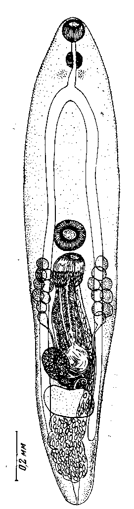 Правый желточный проток идет кзади дорзально от яичника или между яичником и правой ветвью кишечника, левый проходит дорзально от тельца Мелиса. Желточный резервуар овальный или эллиптический, 0,015—0,070 X 0,045 — 0,110 мм, расположен поперечно или, реже, слегка наискось по отношению к яичнику, на медианной линии. Зрелые яйца светло-коричневые, продолговато-овальные, почти полукруглые в профиль, 0,015—0,021 X 0,009—0,012 мм, с коротким фила-ментом до 0,008 мм длины на полюсе, противоположном крышечке; незрелые яйца бесцветны, с филаментами или без них. Экскреторное отверстие терминальное; экскреторный пузырь медианный, широкий, трубчатый, простирается до уровня лежащего немного позади концов ветвей кишечника. Экскреторный пузырь соединен с двумя собирательными каналами, направленными вперед.