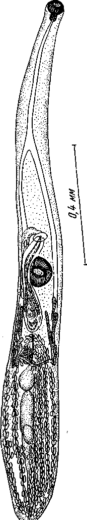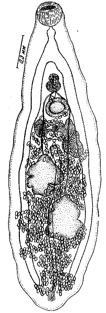 Описание вида (по Ямагути, 1952). Тело тонкое, нежное, длина 0,7—2,9 мм, ширина 0,15—0,28 мм; наибольшая ширина либо на уровне заднего семенника, либо на уровне яичника и желточников. Передняя часть тела суживается и оканчивается тупо. Задний отдел тела близок по длине переднему, на конце тупо закруглен. Кутикула тонкая, невооруженная, если шипы не выпали вследствие мацерации. Субкутикулярная мускулатура очень слабо развита. Ротовая присоска терминальная, чашевидная; ее размеры 0,060—0,066 X 0,070—0,078 мм. Мускулатура ротовой присоски очень слабая. Префаринкс имеется. Фаринкс овальный, 0,036 X 0,030 мм. Пищевод очень узкий; его длина 0,11— 0,75 мм, бифурцирует в задней части передней трети тела.