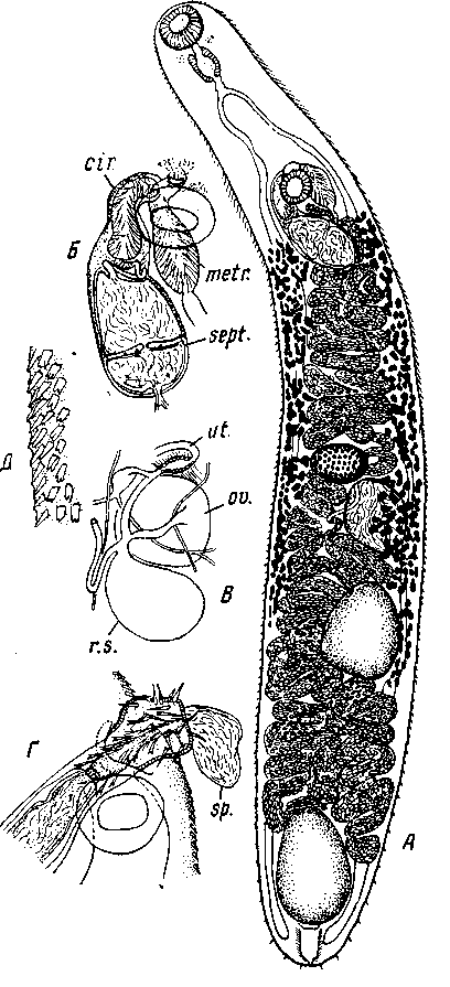 A — марита; Б — концевые элементы половой системы; В — женский половой аппарат; Г - часть вывернутого цирруса со сперматофорой; Д — часть кутикулы с шипиками. cir. —циррус; metr. — метратерм; sept. — перегородка; ut — матка; ov — яичник; sр — сперматофора; r. s — желточный резервуар