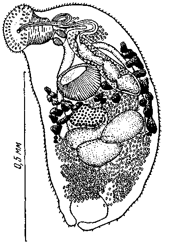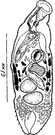 Половая бурса представляет собой сильно вытянутое образование, заключающее в себе семенной пузырек, простатическую часть, ее латеральный дивертикул и семяизвергательный проток. Бурса тянется от задней границы брюшной присоски до переднего конца тела и достигает 0,46 мм длины. У некоторых экземпляров циррус выворачивается из полового отверстия, которое находится дорзо-медианно по отношению к ротовой присоске. Крупный яичник в форме груши лежит несколько влево позади брюшной присоски и имеет размер 0,11x0,138 мм.