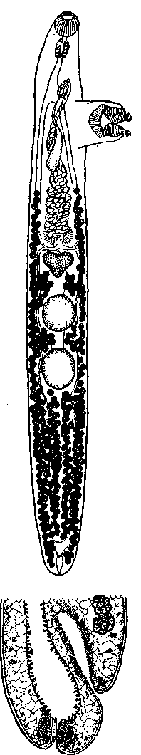 В области семенников этот пузырь сжат дорзо-вентрально, а вне семенников имеет почти круглую форму и лежит прямо под дорзальной поверхностью тела. Экскреторное отверстие расположено на заднем конце тела.