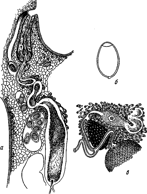 а — выводные половые протоки; б — яйцо; в — комплекс женских половых органов