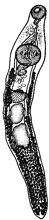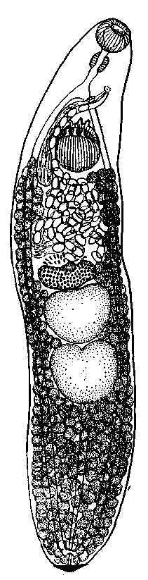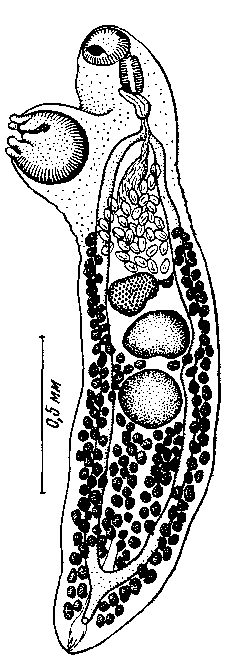 Желточные фолликулы, начинающиеся непосредственно позади брюшной присоски, до уровня заднего семенника, простираются вдоль кишечных стволов по боковым полям тела, а позади заднего семенника тянутся сплошной массой как в дорзальной, так и в вентральной плоскости.