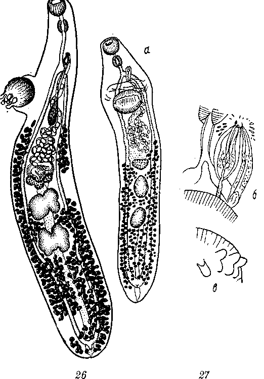 а - марита; б — концевые участки половых протоков; в — сосочки на брюшной присоске