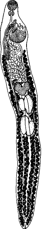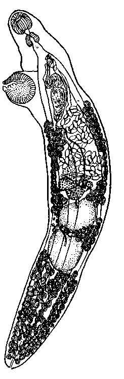 Матка описывает несколько поперечных петель, выходя вентрально за пределы кишечных стволов; ее проксимальная часть, функционирующая как семяприемник, содержит не очень много яиц. Метратерм тянется по левому краю семенного пузырька и половой бурсы. Яйца овальные, светло-коричневого цвета; они достигают 0,054—0,066Х 0,033—0,042 мм. Желточники начинаются несколько позади брюшной присоски, иногда непосредственно латерально от кишечных стволов впереди яичника; они проникают в пространство между яичником и передним семенником и между обоими семенниками и занимают все свободное пространство позади семенников. На уровне семенников желточники могут прерываться. Желточный резервуар круглый или овальный; лежит впереди и дорзально от яичника.