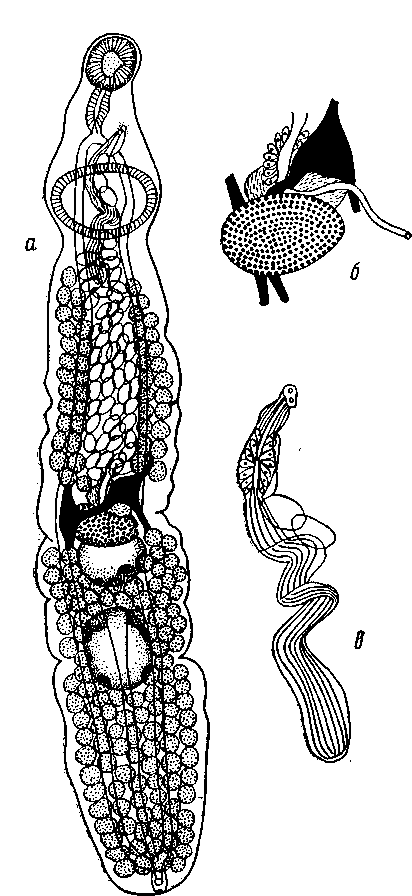 a — марита; б — женские половые органы; в — выводные половые протоки