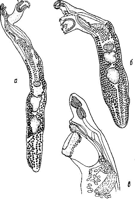 а - марита о брюшной присоской на стебельке; б — марита с сидячей брюшной присоской; в — срез через передний конец тела