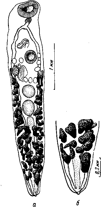 Желточники хорошо развиты; они в основном расположены латерально, но налегают на кишечные стволы, а позади заднего семенника располагаются медианно. Желточные фолликулы крупные. Желточный резервуар лежит слева от семяприемника. Матка начинается от задней стороны оотипа между отверстием семяприемника и желточным резервуаром. Она вначале идет назад, а затем заворачивает вперед, образуя несколько петель между передним семенником и половым отверстием. Яиц немного; они имеют овальную форму, достигают 0,11—0,12 мм длины при ширине 0,08—0,09 мм.