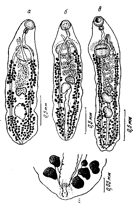 a, 6 — марита с одним семенником; в — нормальная марита; г — задний конец тела с анусом