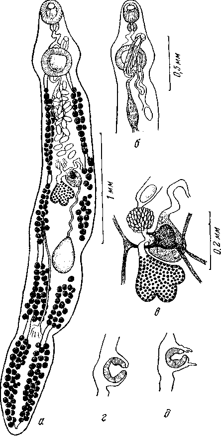 a — марита; б — концевой участок полового аппарата; в — комплекс женской половой системы; г — брюшная присоска (латеральный срез); д — брюшная присоска (медианный срез)