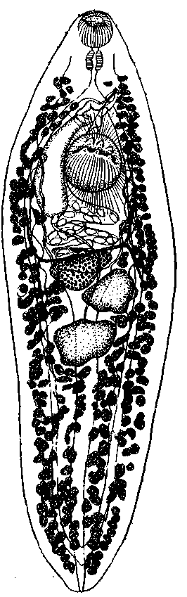 Яичник трехлопастной, субмедианный, находится кпереди от семенников. Тельце Мелиса лежит впереди яичника. Матка образует поперечные петли между тельцем Мелиса, брюшной присоской и кишечными стволами.