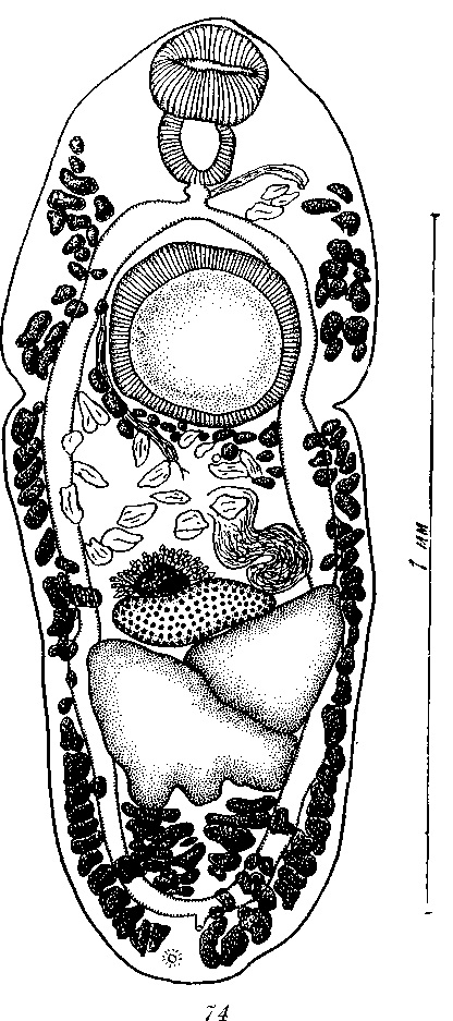 Их ширина превышает длину, причем их контур либо цельнокрайный, либо имеет несколько неправильные очертания. Vasa eiferentia отходят от середины переднего края семенников, направляются вперед, образуя очень короткий vas deferens на медианной линии тотчас позади брюшной присоски. Наружный семенной пузырек с его тонкими стенками имеет вид длинной, почти одинаковой на всем протяжении трубки, образующей одну петлю либо близ своей середины, либо возле своего конца между брюшной присоской и кишечной бифуркацией. Он расположен справа от брюшной присоски пли заходит дорзально за ее задний край. Его передняя часть направляется вперед наискось с левой стороны тела и входят в очень маленькую, но заметную половую бурсу, лежащую слева и несколько впереди от кишечной бифуркации.