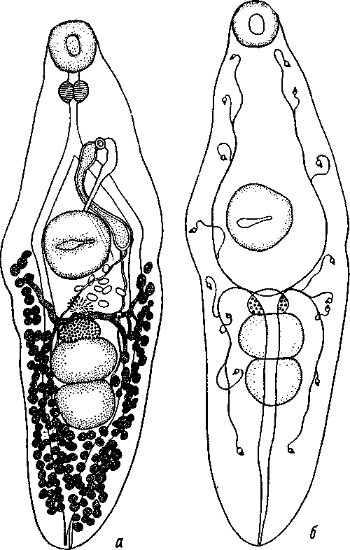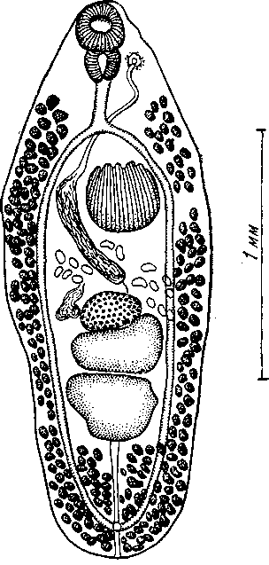 Яичник имеет форму эллипса, достигает 0,07—0,09 мм в поперечнике, расположен медианно впереди семенников, либо соприкасаясь с ними, либо отделен от переднего семенника очень узким пространством.