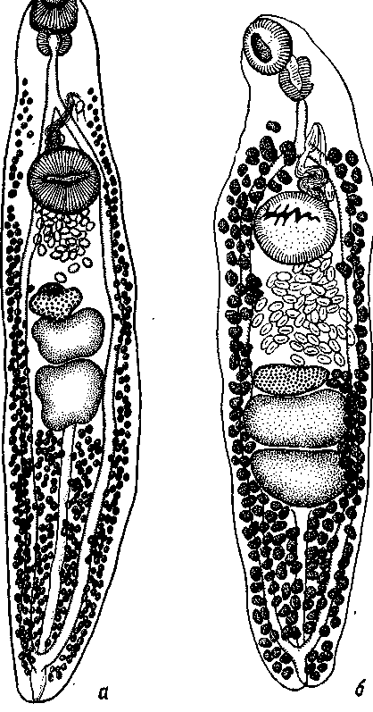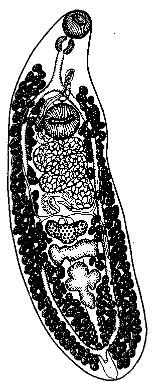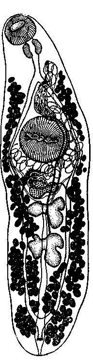 Семенники выемчатые или более или менее лопастные, расположены вплотную один за другим в третьей четверти длины тела. Семенной пузырек, достигающий 0,057—0,072 мм ширины, простирается до переднего края или до середины брюшной присоски. Половая бурса 0,036—0,120 X 0,020 — 0,025 мм. Половое отверстие находится несколько слева от пищевода. Яичник трехлопастной, лежит на середине тела, непосредственно впереди семенников; его размеры 0,06—0,13 X 0,09—0,21 мм.